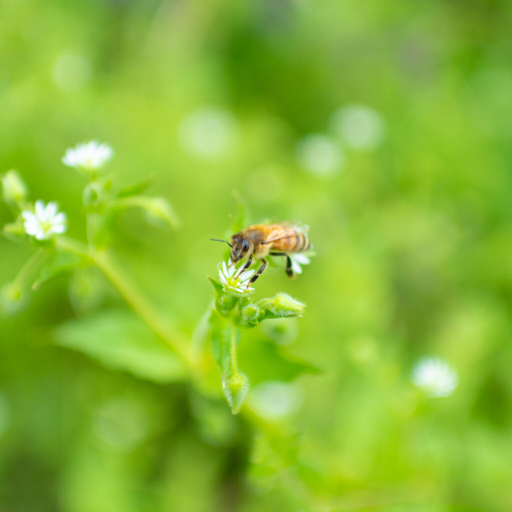 静寂な森の中、樹々の香りがそっと風に溶ける場所で、ミツバチたちはせっせと蜜を運びます。