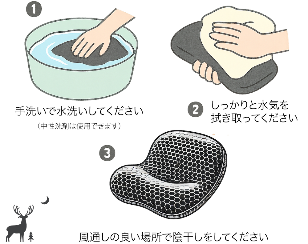 洗った後は、タオルで水気をよく拭き取り、直射日光を避けた風通しの良い場所で平らに干し、完全に乾いてからご使用ください。